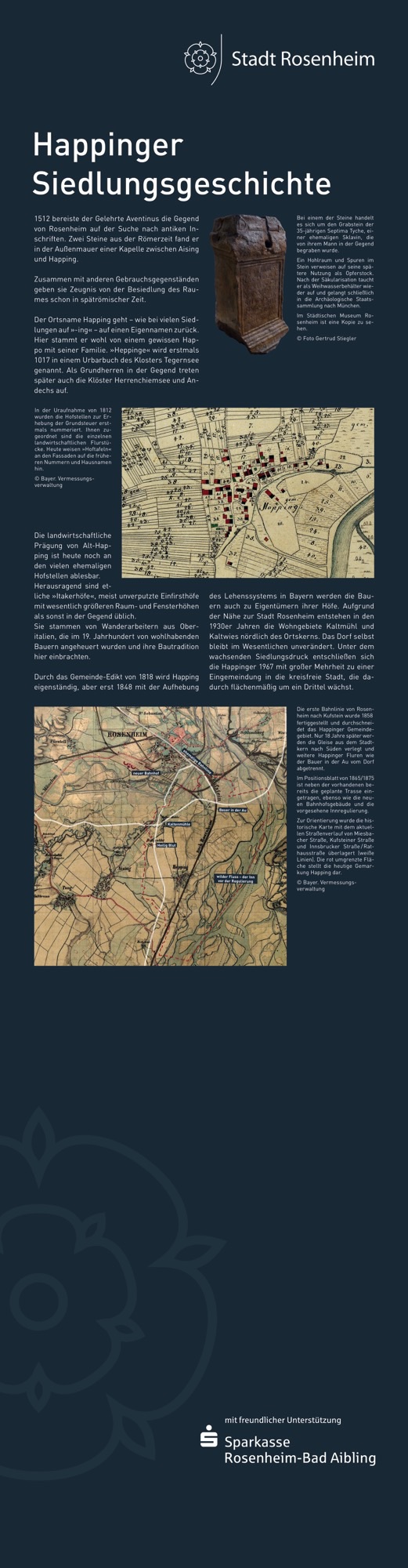 In der Reihe von Infostelen zu historischen Ortsteilen von Rosenheim wurde nun auch im Ortsteil Happing eine Schautafel aufgestellt nach dem Vorbild in Westerndorf am Wasen und an der Kaltenmühle. Sie informiert seit April 2023 vor Ort über die Geschichte der Kirche. Die Rückseite gibt Auskunft über das Dorf und die umgebende Landschaft.