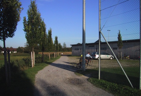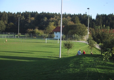 Zwei große Rasenfelder, mehrere Kleinspielfelder und ein Asphaltplatz für Basketball und Rollhockey gruppieren sich um das Vereinsgebäude. Die Wohnbebauung wird durch eine Lärmschutzwand mit Aussichtshügel abgeschirmt. Säuleneichen entlang der Hangkante weisen von Weitem auf das Sportgelände hin, den Übergang zur Landschaft bilden offene Obstwiesen.