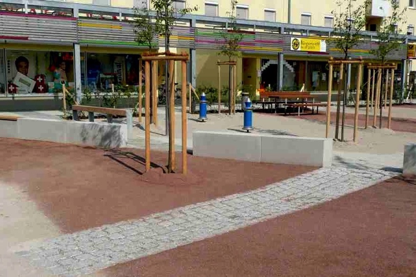Der Vorplatz zum Bürgerhaus an der Lessingstraße Rosenheim wurde mit einfachen Mitteln befestigt und begrünt. Als Stadtteilzentrum bildet er einen wichtigen Freiraum für die Anwohner.